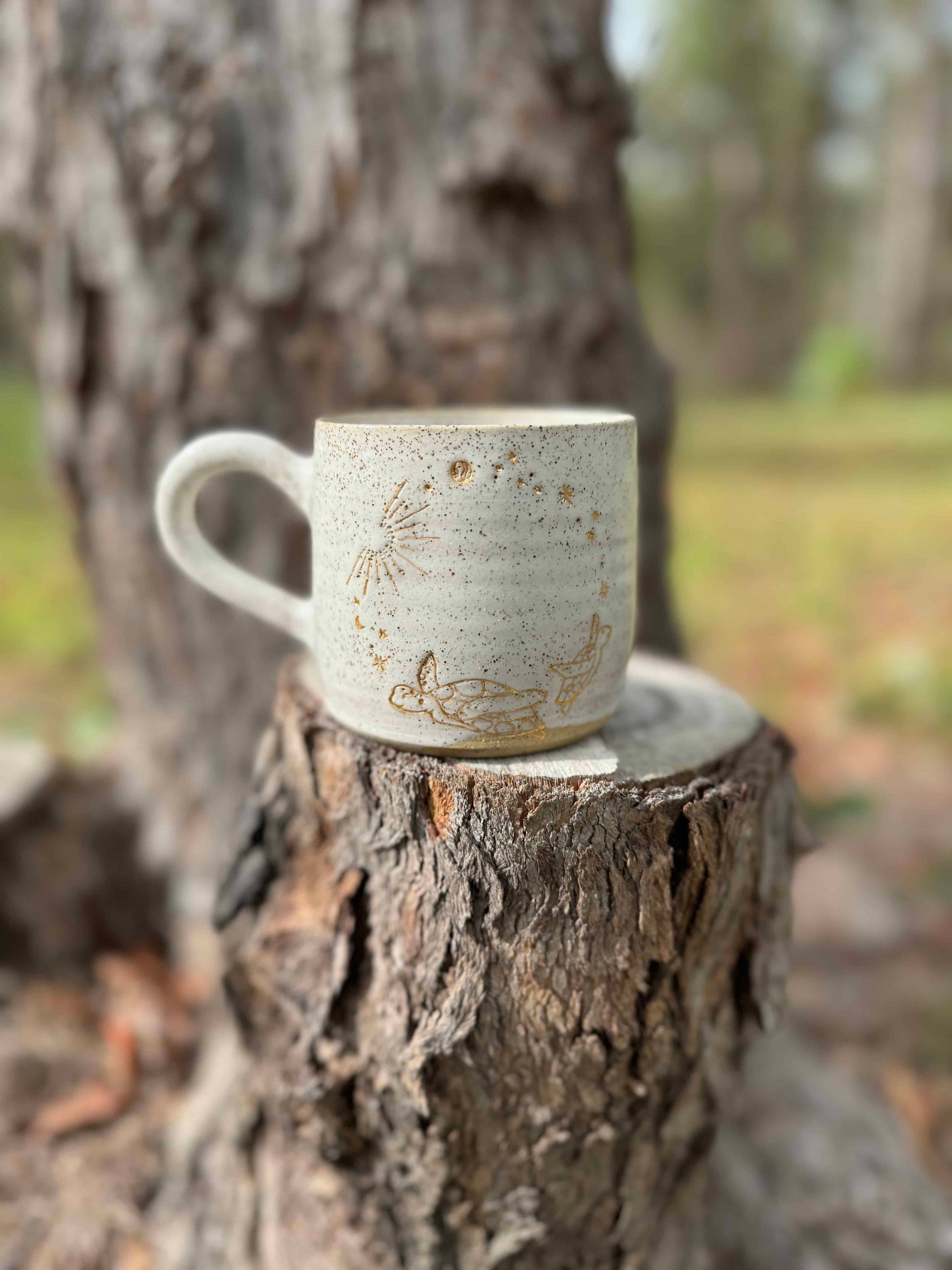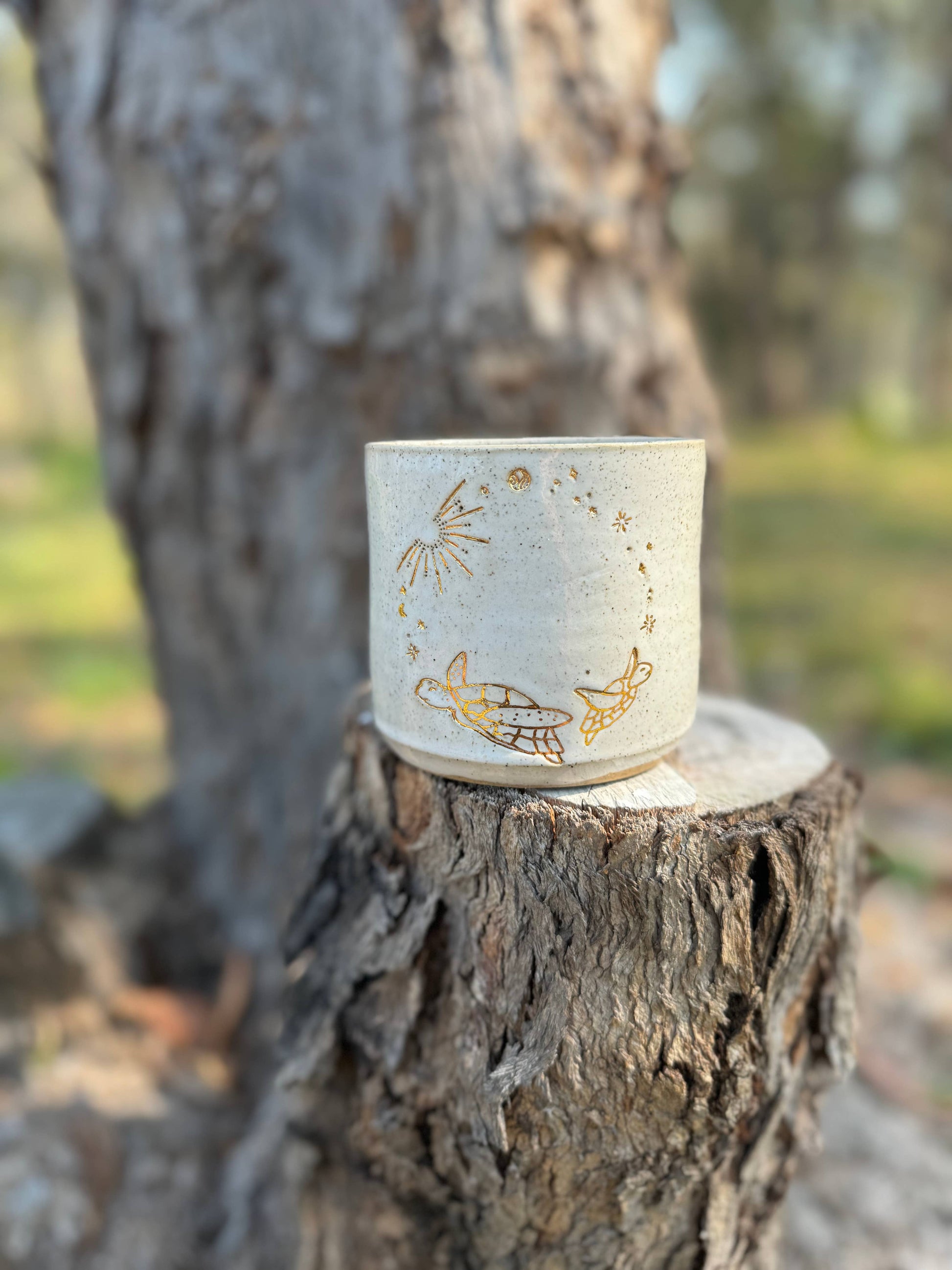 This ceramic Turtle in the Universe mug features a light speckled clay with white glaze and the impression is lined with real 22k gold lustre. Handmade in Australia.