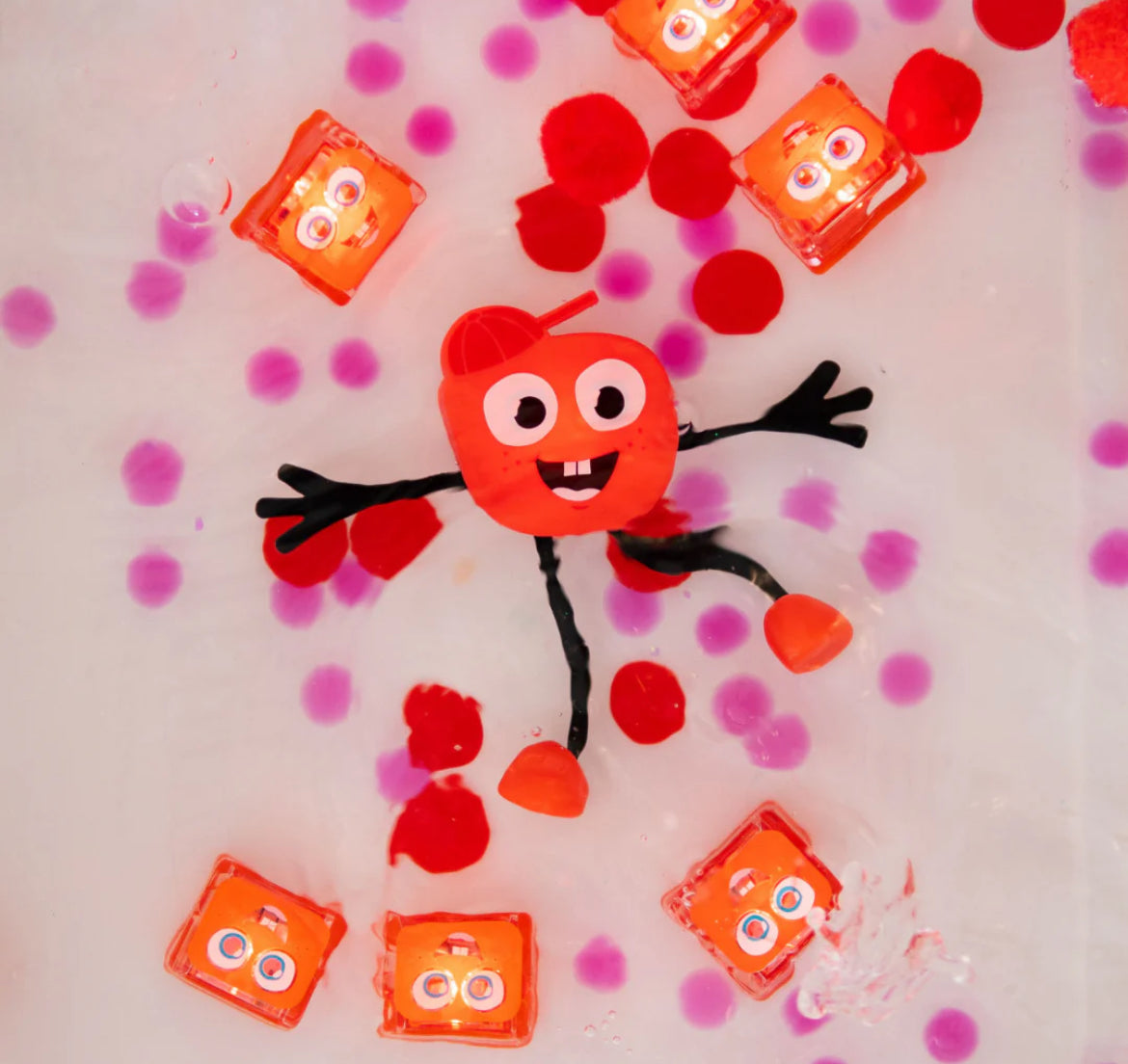 Perfect for sensory play, water play and bath time! Put them in water and watch them light up. Then shake them off, dry and place on side. Each pack comes with 1 character + 2 light up cubes. Add the cubes into the back of the character and watch them light up too.