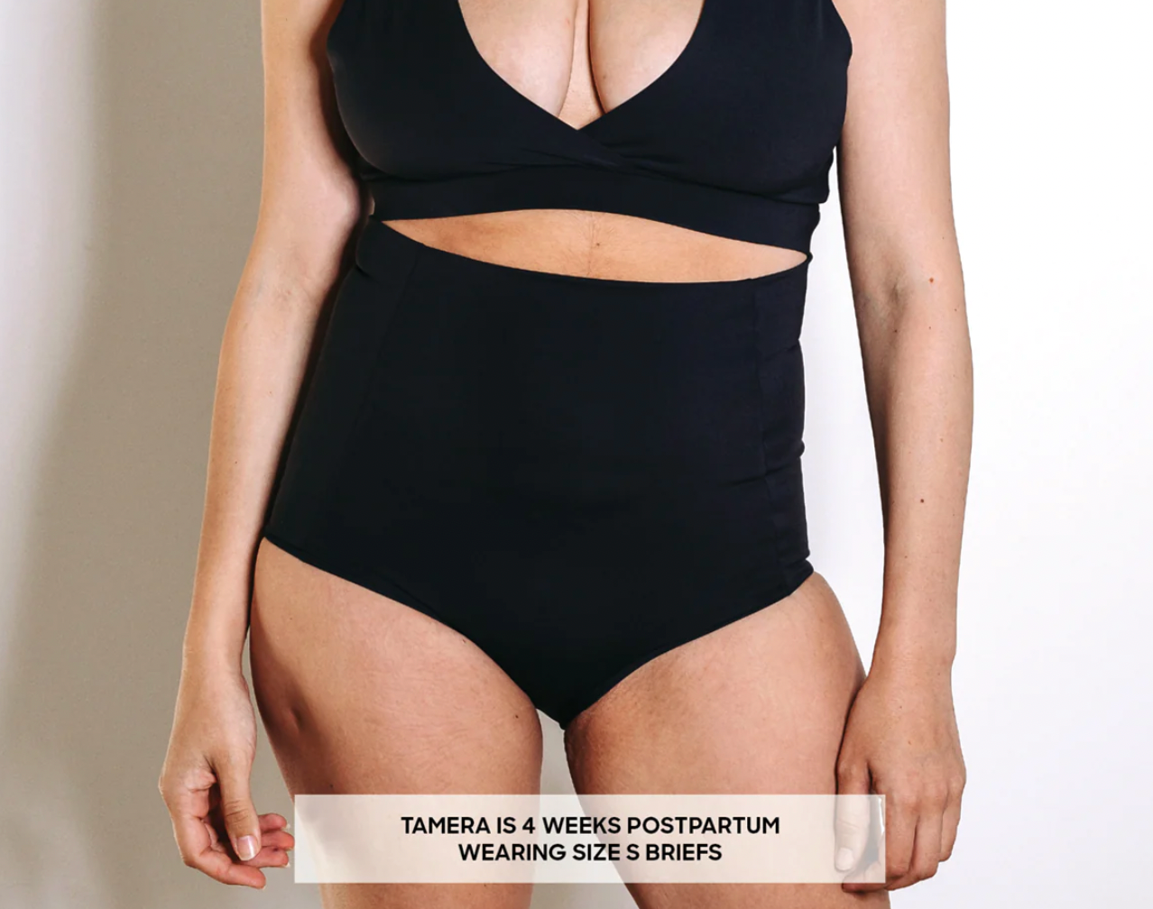 Tamera is 4 weeks postpartum. She wore Medium briefs straight after birth and is now wearing Small briefs for extra support.