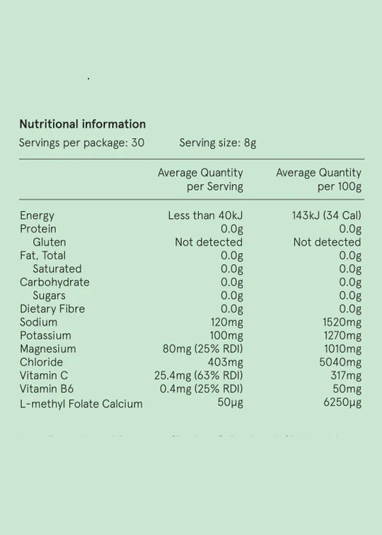 Natural Sweetener (Erythritol - natural food grade derived from vegetable), Mineral Salts (Magnesium Chloride, Sodium Chloride, Mono Potassium Phosphate, Sodium Citrate), Ginger, Natural Flavours derived from vegetable and fruits, Natural Colours derived from vegetables and fruits, Vitamins (Ascorbic Acid, L-Methyl Folate Calcium, Vitamin B6 - Pyridoxine Hydrochloride).